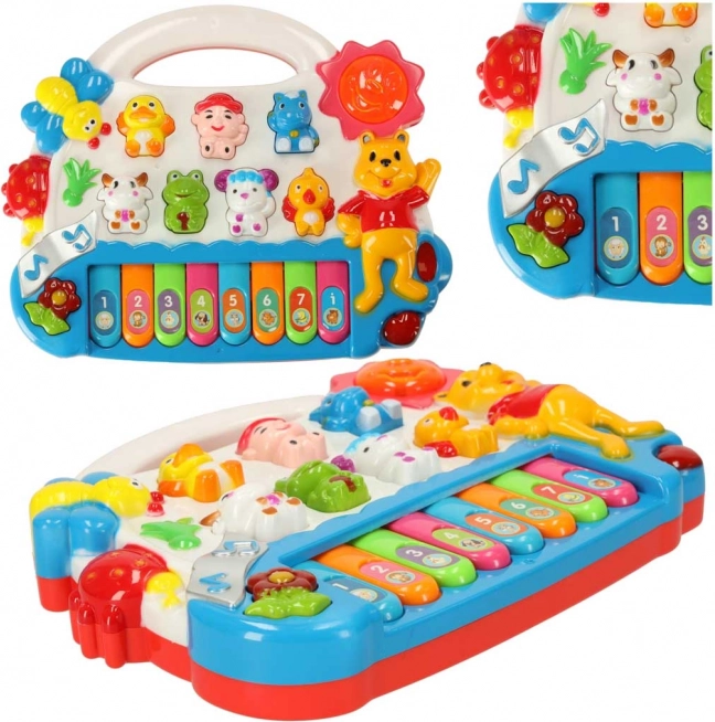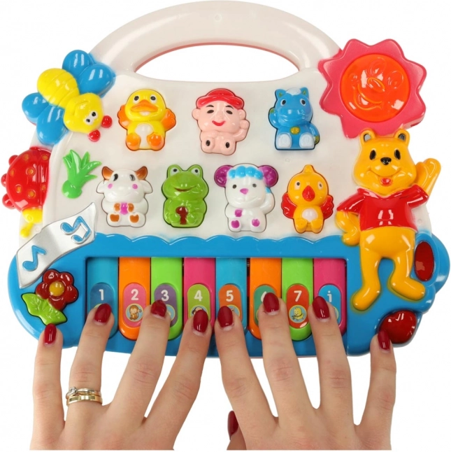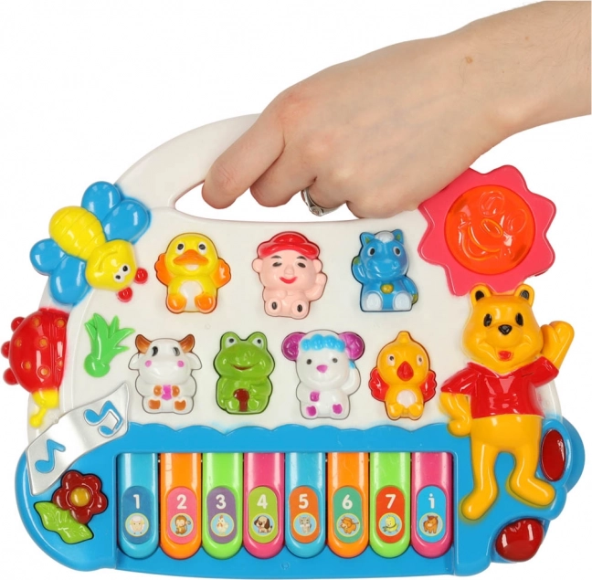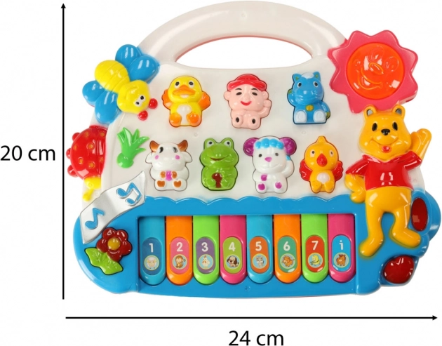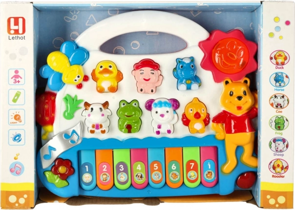 De schattige piano met vrolijke diertjes trekt de aandacht van kinderen vanaf de eerste momenten. Afhankelijk van de gekozen modus speelt hij de toonladder, melodieën of dierengeluiden af. Wanneer je de toetsen indrukt, licht het zonnetje op, wat kinderen motiveert tot verdere interactie en ontdekking.