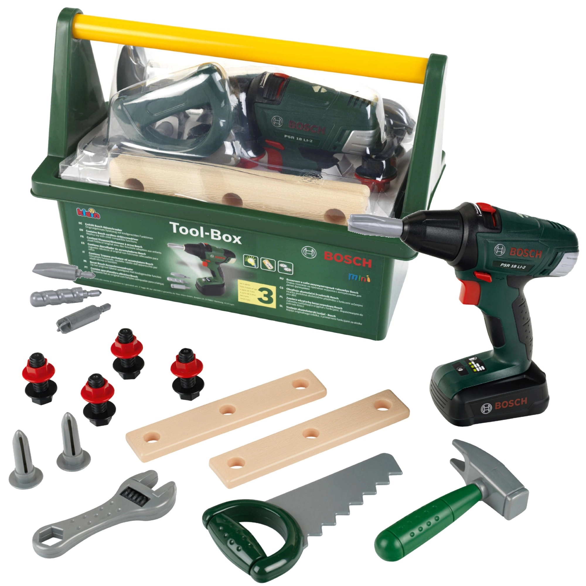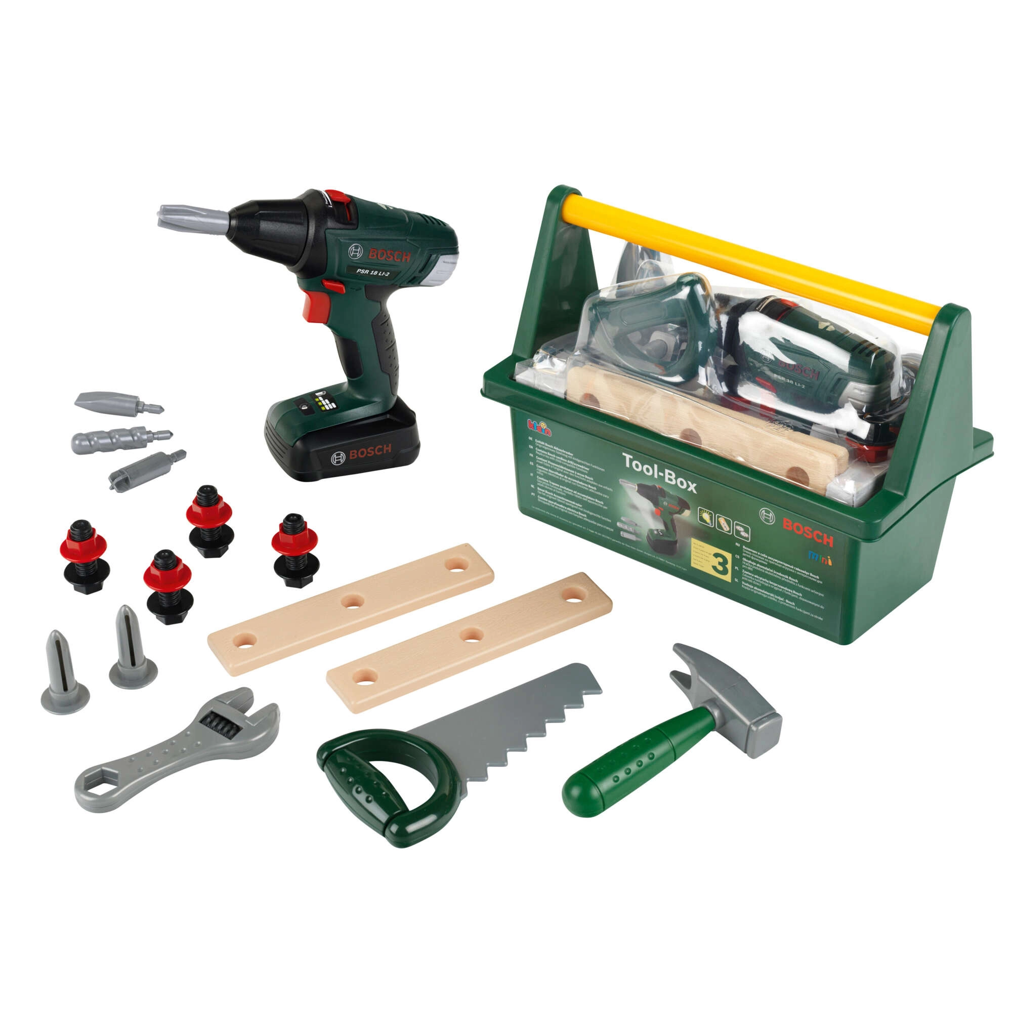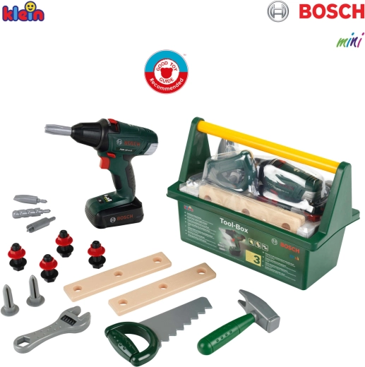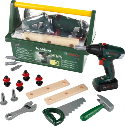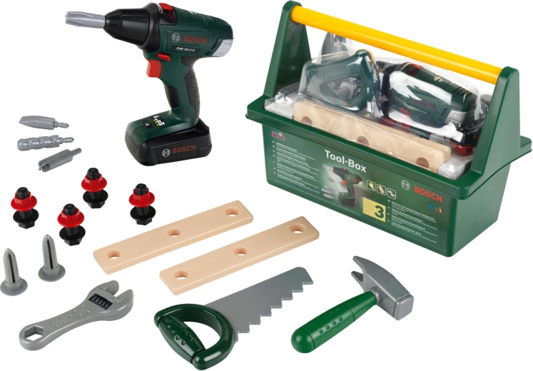 Deze hoogwaardige kinderset is ontwikkeld onder BOSCH-licentie en ontworpen om echt gereedschap natuurgetrouw na te bootsen, terwijl hij volledig veilig voor kinderen is. De robuuste donkergroene gereedschapskoffer met comfortabel geel handvat houdt alle onderdelen netjes bij elkaar en maakt dragen eenvoudig.