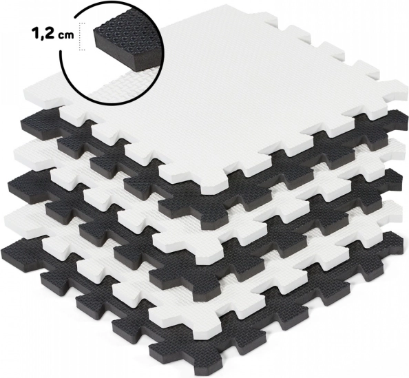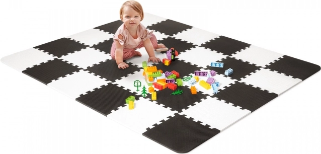 De stijlvolle zwart-witte KINDERKRAFT Luno schuimmat biedt kinderen vanaf 10 maanden een zachte en veilige speelruimte. De delen zijn eenvoudig als puzzel in elkaar te zetten, de onderlegger is afwasbaar, geluiddempend en isolerend tegen kou. Het geribbelde oppervlak is antislip en zonder uitneembare onderdelen. Dikte 1,2 cm, 30 tegels van 29,5 × 29,5 cm.