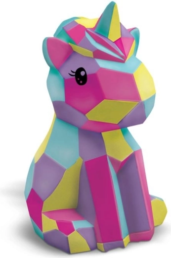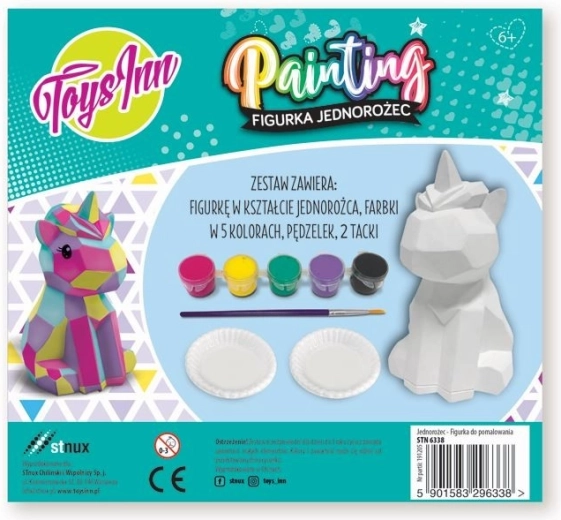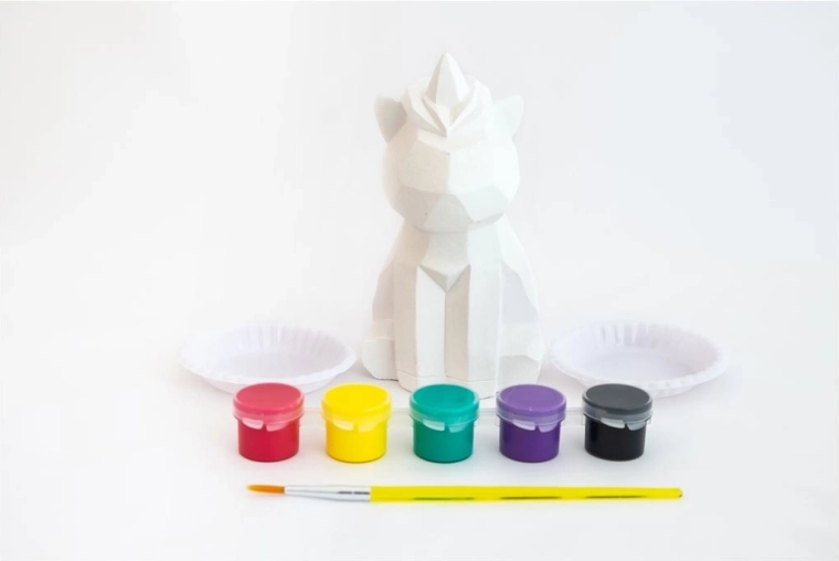 De set bevat een eenhoornfiguur om te schilderen, 5 kleuren, een penseel en twee kommetjes om verf te mengen.
