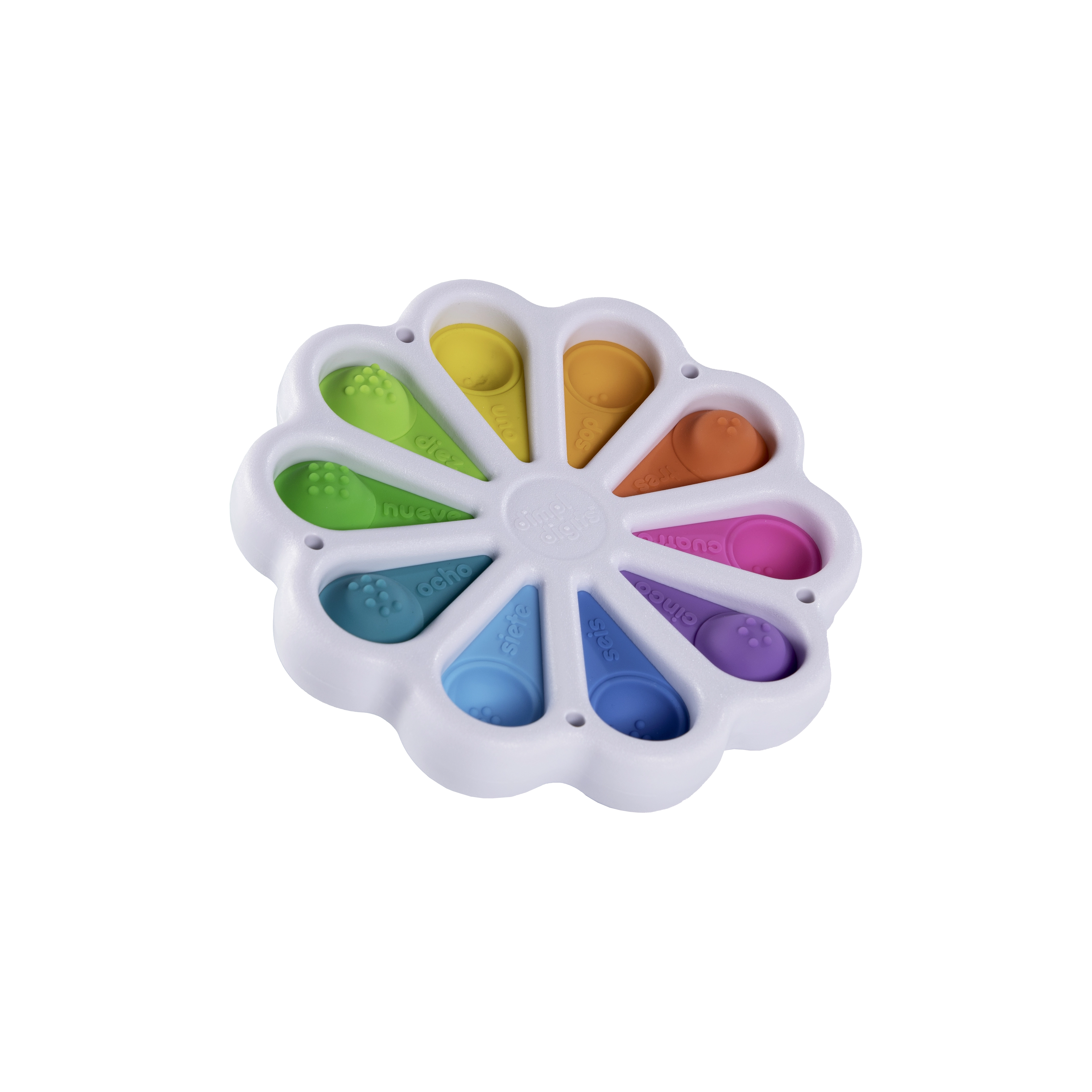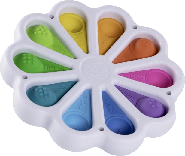Het zintuiglijke speelgoed Dimpl Digits biedt kinderen een rustgevend pop-effect en tegelijk de eerste stappen naar het herkennen van cijfers. Aan de bovenkant van elke bubbel staat een cijfer met het Engelse woord, aan de onderzijde het aantal stippen dat bij het cijfer hoort – zo verbinden kinderen op natuurlijke wijze zicht, tast en basisrekenvaardigheden.