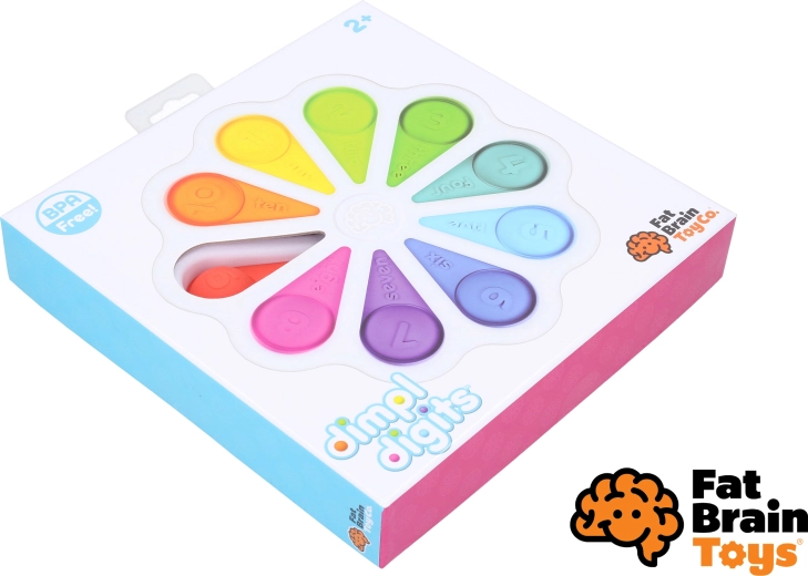 Ontdek het leuke zintuiglijke speelgoed Dimpl Digits van FAT BRAIN – bloemvormige drukbubbels met cijfers en tellen die fijne en grove motoriek, oog-handcoördinatie en een gezonde psychomotorische ontwikkeling stimuleren. Gekleurde siliconen bubbels nodigen uit om in te drukken, kleuren te leren en de eerste cijfers te ontdekken. Geschikt vanaf de geboorte.
