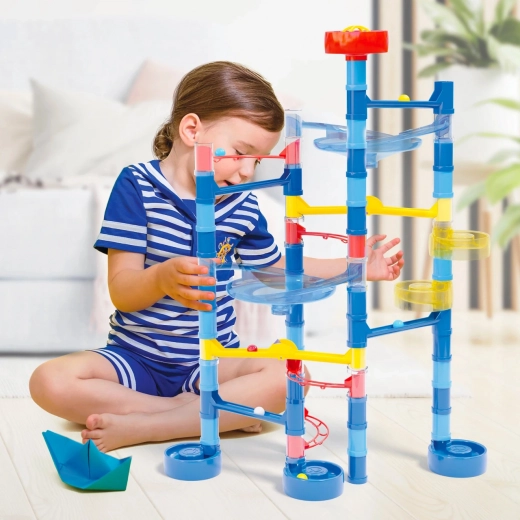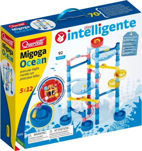 Met het knikkerspoor Migoga Ocean duiken uw kinderen in de wereld van creativiteit en plezier. Deze set biedt een constructie vol spiralen, bruggen en glijbanen. Kinderen leren de basisprincipes van de natuurkunde, vooral zwaartekracht- en mechanische wetten.