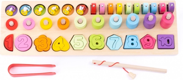 Deze multifunctionele houten speelgoedset is ideaal voor de eerste stappen in de wereld van tellen en vormen. Kinderen oefenen spelenderwijs het onderscheiden van kleuren, het koppelen van cijfers 1–10, het rijgen van ringen en het vangen van onderdelen met de magnetische hengel. Er zijn ook plastic pincetten inbegrepen om de moeilijkheidsgraad te verhogen en de greep te trainen.