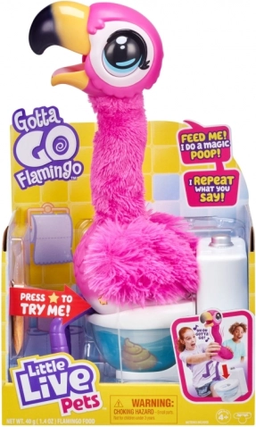 De leuke interactieve flamingo Little Live Pets zal kinderen verrassen doordat hij zich laat voeren met speciaal Aqua-zand, zingt, danst, praat en na het eten naar het toilet gaat. Hij kondigt het aan met de Engelse zin “Uh, oh, I gotta go”, herhaalt de woorden van zijn eigenaar en dankzij het herbruikbare zand zorgt hij keer op keer voor plezier.