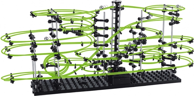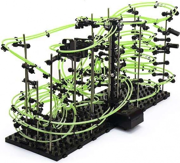 Na het monteren zie je hoe de metalen knikkers naar beneden razen en met de spiraallift weer terugkeren naar de start. In het donker licht de baan op, waardoor elke rit indrukwekkend oogt. Demonstreer aan familie en vrienden in de praktijk de basisprincipes van de natuurkunde – snelheid, zwaartekracht en middelpuntvliedende kracht.