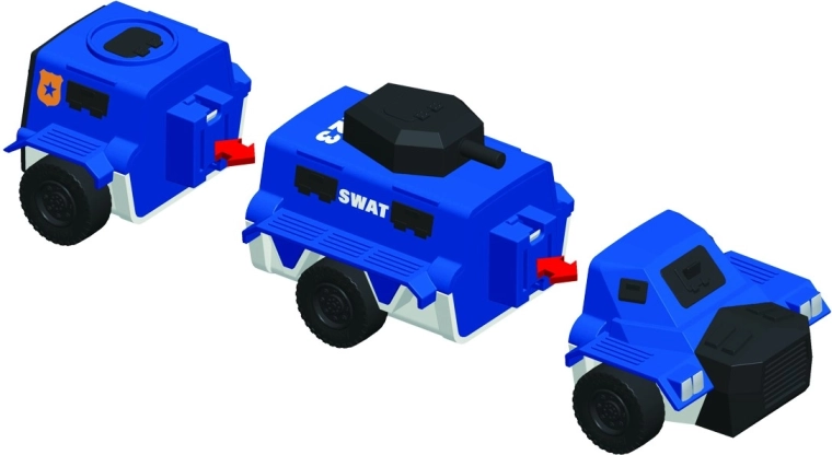 Sterke maar veilige verbindingen maken het kinderen mogelijk om snel onderdelen te wisselen en moeiteloos nieuwe politievoertuigen te creëren.