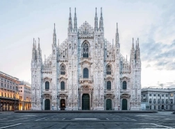 Geniet van de gedetailleerde weergave van de beroemde Milanese kathedraal met rijke gotische architectuur en indrukwekkende torens.