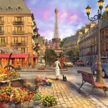De scène omvat een levendige straatsfeer met bloemenkraampjes en klassieke architectuur, wat de complexiteit en levendigheid benadrukt.