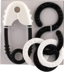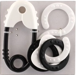 Deze set rammelaars bevat een klassieke veiligheidsspeld en een achtvormige rammelaar met ringen.