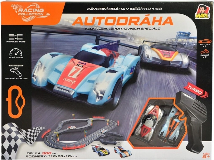 In de verpakking zitten twee raceauto’s en twee handregelaars voor een vliegende start en precieze snelheidscontrole. De racebaan is verpakt in een Tsjechische doos en is ideaal als cadeau voor jonge én volwassen racefans.