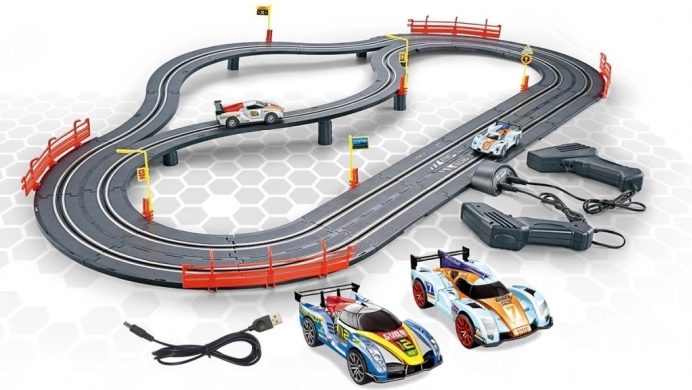 Racebaan 300 cm met USB‑voeding zonder adapter. Twee auto’s, twee regelaars, brug en accessoires. Geweldig speelplezier voor kinderen vanaf 8 jaar en volwassenen.