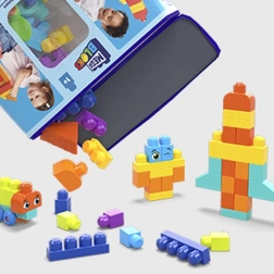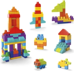 In de doos vind je 150 grote blokken, inclusief speciale elementen: een onderstel met wieltjes voor voertuigen, blokken met oogjes voor speelse figuurtjes, blaadjes voor natuurthema’s en dakelementen voor gebouwen. Alles is volledig compatibel met andere MEGA BLOKS-sets, zodat de set naar wens kan worden uitgebreid.