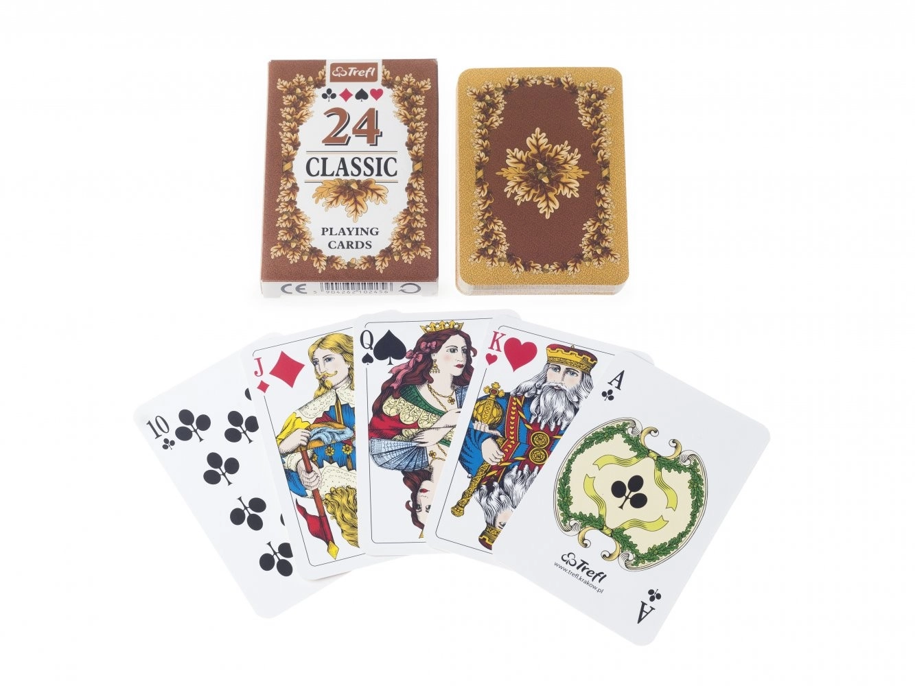 Klassieke speelkaarten Muduko Classic met een motief van eikenbladeren zijn ideaal voor populaire kaartspellen. Deze compacte set bevat 24 kaarten van negens tot azen met internationale symboolaanduiding van kleuren en figuren, en kenmerkt zich door een traditioneel design en hoogwaardige afwerking van fabrikant Trefl-Kraków.