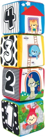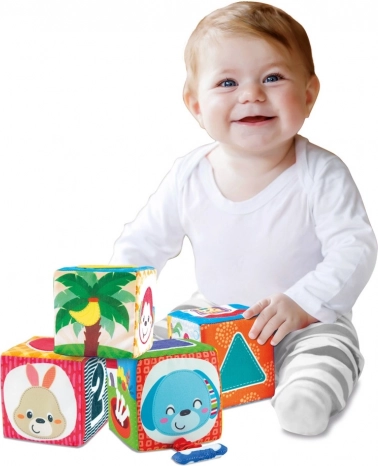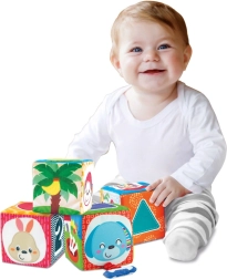 Ontdek een set van 4 kleurrijke, zachte textielblokken voor baby’s en peuters die het zintuiglijk waarnemen, de fijne motoriek en het leren van cijfers en vormen stimuleren. Elk blok heeft verschillende texturen, een veilig spiegeltje en illustraties van dieren, cijfers en vormen. De blokken kunnen worden gestapeld tot een stabiele piramide en samengevoegd tot afbeeldingsreeksen voor spelenderwijs leren.