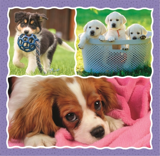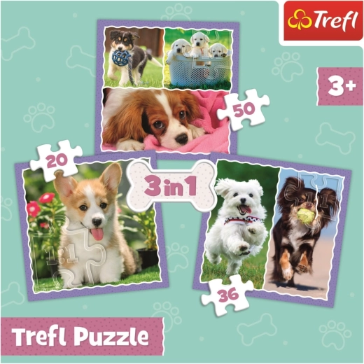 Set kinderpuzzels van Trefl met het motief van schattige puppy’s, met 3 aparte puzzels met afbeeldingen van 200 × 195 mm. Dankzij het verschillende aantal stukjes hebben zowel jongere als oudere kinderen plezier. Gemaakt in Polen van ecologische materialen, geschikt voor kinderen vanaf 3 jaar.
