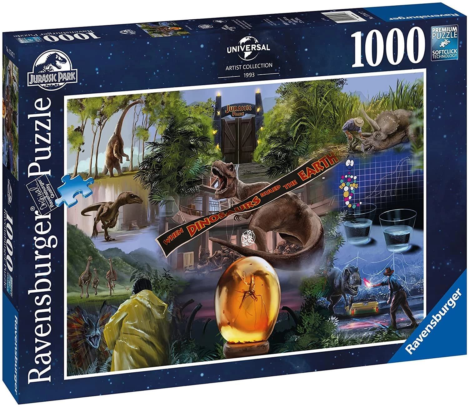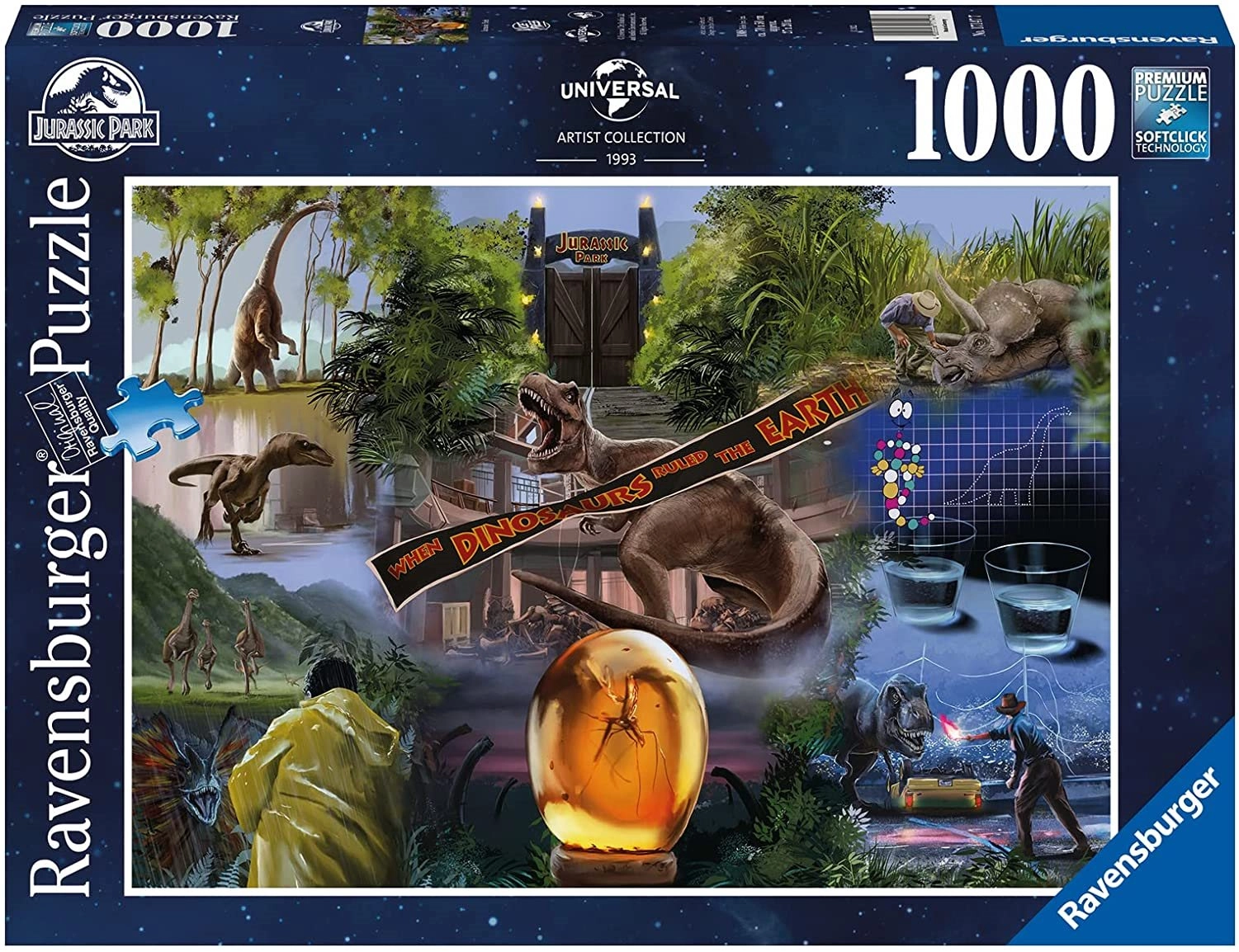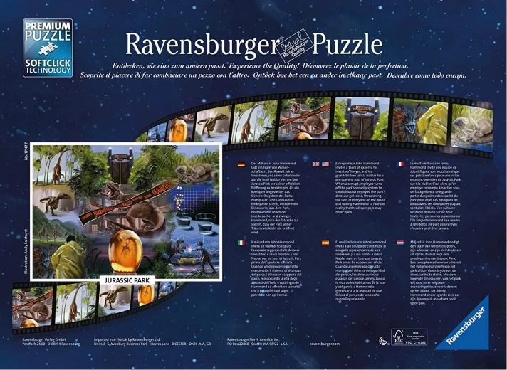 De serie Ravensburger-puzzels met 1000 stukjes biedt unieke en interessante motieven om te leggen, in dit geval een puzzel met een motief uit de film Jurassic Park.