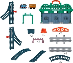 Beleef de wereld van het Eiland Sodor met de set Station Knapford van Fisher‑Price. Kinderen bouwen een baan met station, brug en viaduct, waarover THOMAS als duwtrein met een passagierswagon rijdt. Door op het dak te drukken 'verschijnen' passagiers in de wagon – ideaal om verhalen te bedenken en de fantasie te prikkelen.