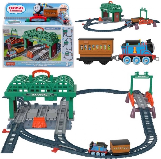 - Station Knapford met opbergpaneel en handvat, railonderdelen, brug, viaduct‑markeringen, locomotief Thomas (push‑along), passagierswagon met passagiers