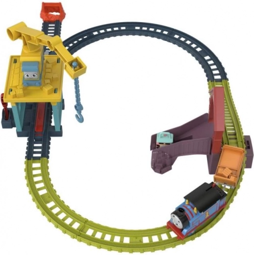 Deze kleurrijke 18-delige batterijset biedt kinderen actief laden en lossen met de kraan, rijden op een ronde baan en het leuke loslaten van het karretje Sandy via de glijbaan. De gemotoriseerde Thomas trekt een goederenwagon, terwijl de draaibare arm van kraan Carly met haak de lading eenvoudig oppakt en verplaatst.