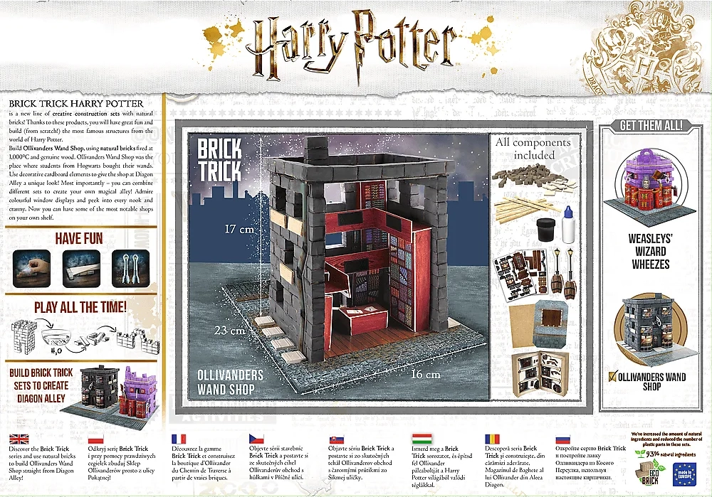 Bouw stap voor stap: lijm steen op steen, snijd en pas de latjes aan en voeg daarna thematische accessoires toe voor de authentieke sfeer van de Wegisweg. Dankzij de in water oplosbare lijm is het model meerdere keren te gebruiken – gewoon weken, uit elkaar halen en opnieuw bouwen. Je kunt de set combineren met andere BRICK TRICK HARRY POTTER-sets en zo een uitgebreide wereld vol tovenarij creëren, inclusief Zweinstein.