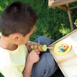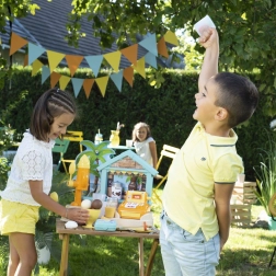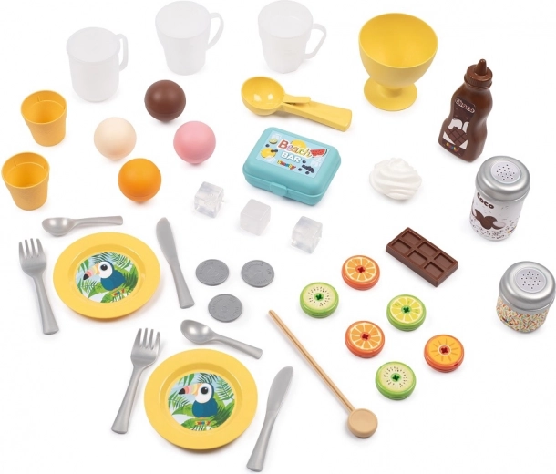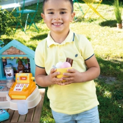 De uitgebreide set met 38 accessoires bevat een ijsmaker, hoorntjes en ijsbollen, een ijslepel, een fruitspies, toppings, servies, bestek en een kassa. Dankzij het compacte formaat is de kraam perfect voor in de tuin, het park en op het strand – ideaal voor jonge gastheren en gastvrouwen van zomerse feestjes.