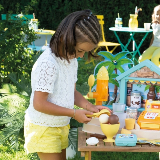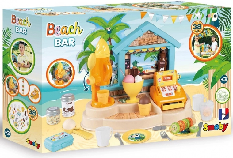 De SMOBY strandbar is een creatieve kinderkraam voor rollenspel als verkoper en klant. Kinderen proberen het maken van ijscoupes, smoothies en fruitspiesen, het versieren met sauzen en strooisels en het afrekenen op een functionerende kassa. Realistische details stimuleren fantasie, sociale vaardigheden en de fijne motoriek.