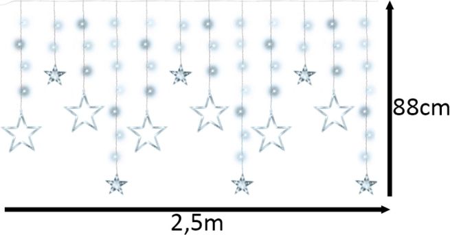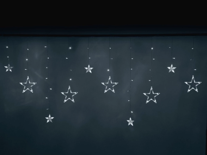 Dit lichtgordijn met transparante sterren in verschillende formaten verlicht ramen, wanden en fotospots. De koud witte kleur zorgt voor een heldere, feestelijke uitstraling en zacht licht, ideaal voor kerstdecoratie, de kinderkamer of romantische avonden.