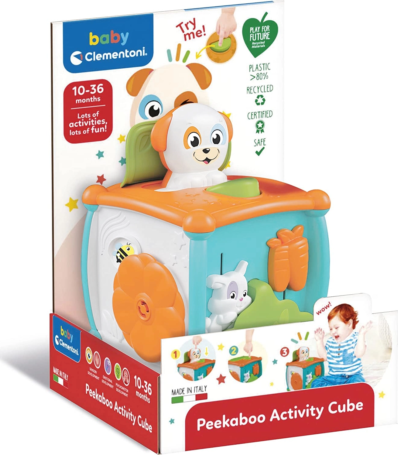 Kleurrijke en dynamische Clementoni-kubus uit de Baby-lijn, vol leuke activiteiten en verrassende effecten. Ideaal voor de ontwikkeling van tastzin en motorische vaardigheden dankzij de uitschuivende diertjes en het gemakkelijke vastpakken.