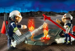 Bevat alle basisuitrusting voor brandweertraining, inclusief brandweermannenfiguren, brandende auto en benodigde accessoires.