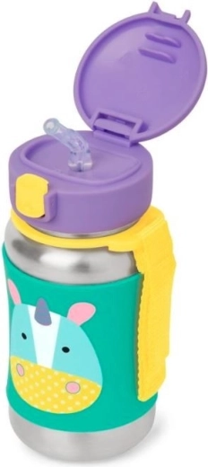 De SKIP HOP Animal Bottle is gemaakt van roestvrij staal en vult perfect de schooluitrusting van uw kleuterschool aan. Het unieke design laat je dorst snel lessen zonder je shirt nat te maken! Zin in een slok water? Klap gewoon het deksel open, gebruik het rietje en sluit het daarna weer – het rietje blijft schoon en de drank beschermd. Om ervoor te zorgen dat de metalen wanden het water koel houden en niet je handen, is de fles voorzien van een antislip, zijdezachte siliconen mantel. De SKIPHOP dierenwaterfles kun je veilig in je rugzak meenemen (zelfs ondersteboven!) of met de plakclip aan elke rugzak of fietsframe bevestigen.