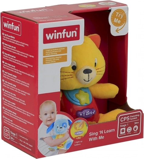 De interactieve pluchen kater betovert baby’s en peuters met vrolijke kleuren, lichtjes en prettige geluiden. Kinderen zullen de drie verlichte knopjes al snel leuk vinden: ze starten melodieën, geluiden en gesproken zinnetjes en maken op speelse wijze kennis met de eerste letters en cijfers.