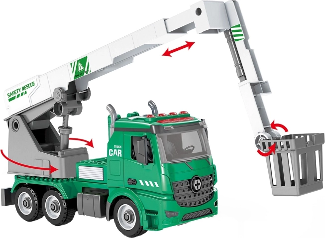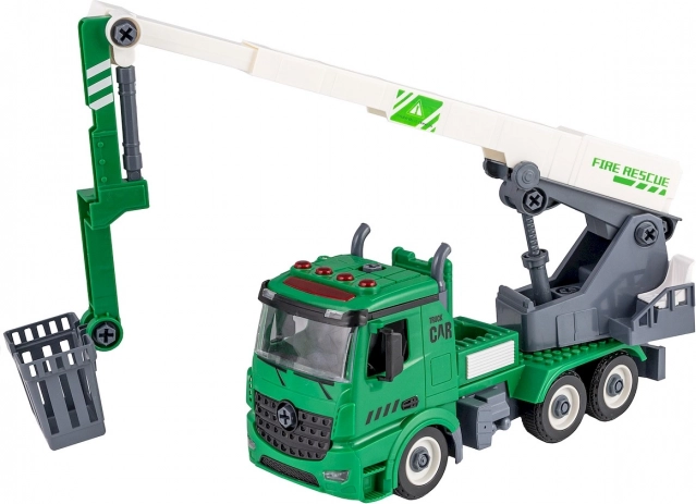 Handige bouwset en speelgoed in één: groen stadsvoertuig met uitschuifbare mand voor reddingsacties biedt de mogelijkheid tot schroeven en opnieuw monteren, realistische licht- en geluidseffecten en mechanische frictieaandrijving. Compatibel met populaire bouwsteentjes voor nog creatiever spel.