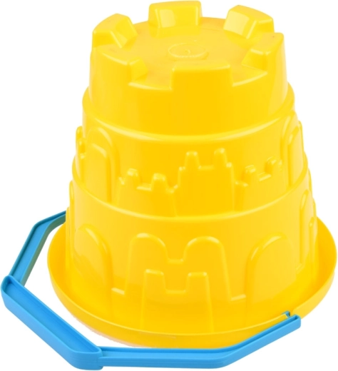 De kunststof emmer met blauwe handgreep en vormpjes binnenin maakt het eenvoudig mee te nemen naar het strand of de tuin.