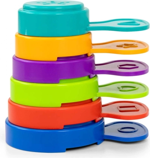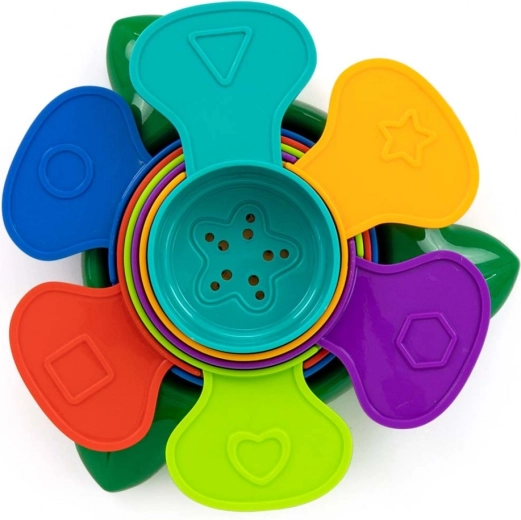 Stapelspeelgoed voor in bad Flower van Milly Mally. 6 kleurrijke bekers om te stapelen, een toren te bouwen of te gebruiken als zandvormpjes. Elke beker heeft gaatjes in de bodem, zodat je er water mee kunt gieten en zand kunt zeven om mee te spelen, op de speelplaats of op het strand. De kleuren en reliëfpatronen op de bekers helpen bij het leren.
