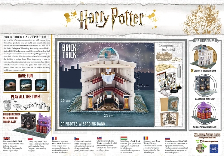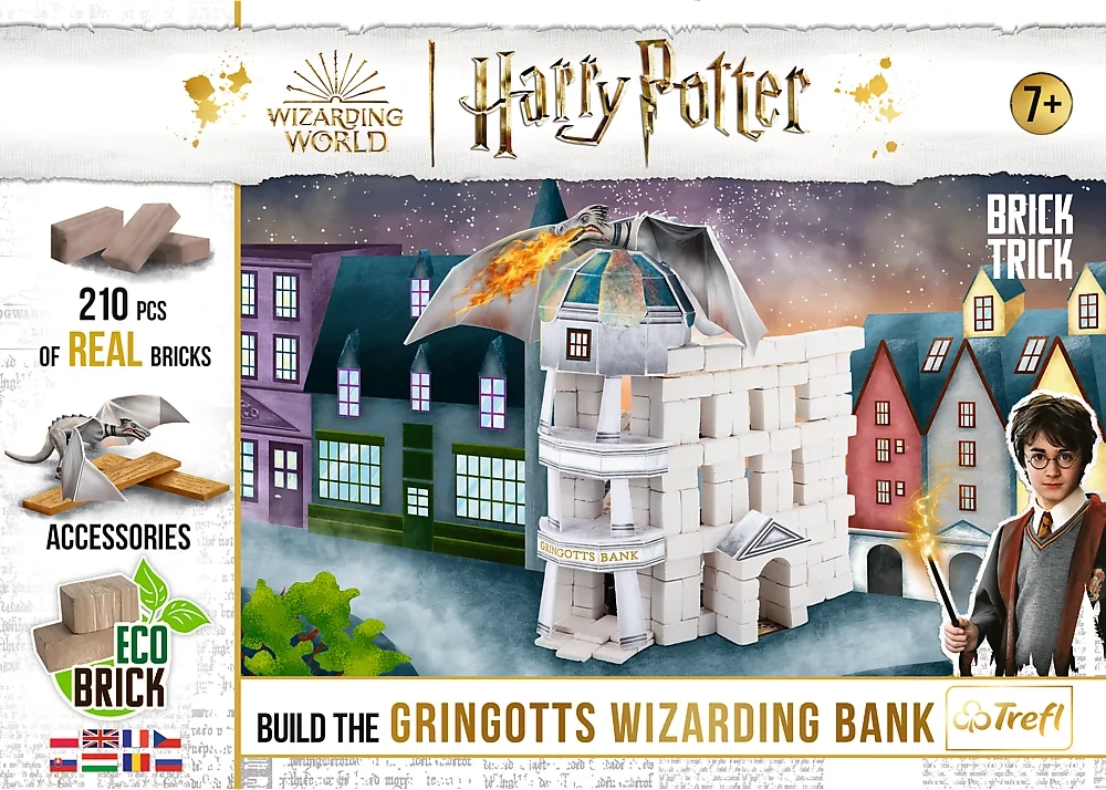 Ontdek het bouwplezier met de unieke Brick Trick HARRY POTTER bouwset, waarmee je stap voor stap de beroemde Gringotts Tovenaarsbank opbouwt. Met natuurlijke materialen bouw je een stevig en gedetailleerd gebouw, af te werken met meegeleverde decoraties – inclusief iconische elementen uit de wereld van toverkunst.