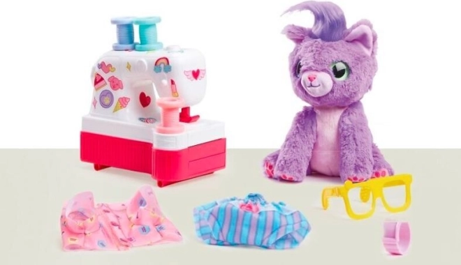 De set bevat ook stickers om de naaimachine te versieren en twee verschillende kledingvarianten voor paarse huisdiertjes, afhankelijk van of het om een kat of een hond gaat.