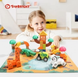 De kleurrijke houten blokken maken het mogelijk om een terreinvoertuig, gebouwen en schattige dieren te bouwen. Details zoals bloemen en een boog geven het spel een unieke charme.