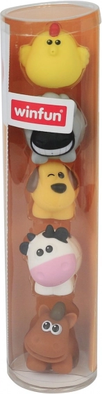Schattige set van vijf badspeeltjes met boerderijdieren – hond, koe, kuikentje, paard en schaap. Dankzij de zachte kunststof en afgeronde vormen zijn ze ideaal voor gemakkelijk vastpakken met kleine handjes en zorgen ze voor veel plezier in bad, thuis en onderweg. Stimuleert de verbeelding en de fijne motoriek.