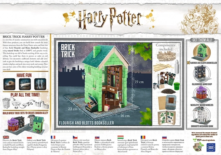 De set is ontworpen met het oog op de natuur: bevat tot 95% natuurlijke materialen en minder kunststof onderdelen. Werk van de fundering tot aan de stijlvolle gevel, voeg mos, steentjes en een uithangbord toe en geef je vitrine op de plank een uniek karakter. Combineert uitstekend met andere sets uit de BRICK TRICK HARRY POTTER-serie om de hele Wegisweg en de omgeving van Zweinstein te creëren.