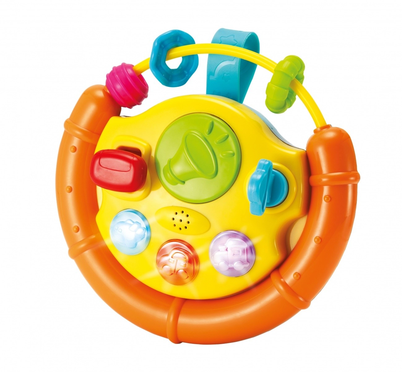 Dankzij de praktische riem bevestig je het speelgoed gemakkelijk aan een ledikant, autostoel of kinderwagen. De draaibare startschakelaar met sleutel, functionele knoppen en draai-elementen verlengen de speeltijd en helpen gehoor, zicht en motorische vaardigheden te ontwikkelen.