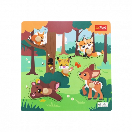 De houten inlegpuzzel met kleurrijke afbeeldingen van bosdieren is ontworpen om kinderen te vermaken en tegelijkertijd hun vaardigheden te ontwikkelen. Elk stukje is stevig, goed vast te pakken en voorzien van een houten knop voor gemakkelijk uitnemen. De onderplaat heeft uitgefreesde vormen met een zwart-wit afbeelding die overeenkomt met het stukje, wat kinderen helpt bij intuïtief toewijzen.