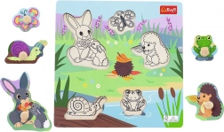 De houten puzzel Dieren in de weide is ontworpen voor kleine kinderhandjes. Vijf robuuste stukjes met houten knopjes zijn gemakkelijk vast te pakken en in de gefreesde vormen van de ondergrond te plaatsen. Elk uitsparing heeft een bijpassende zwart-witillustratie die kinderen helpt om het juiste plekje te vinden.
