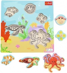 Ontdek de magie van de oceaan met deze houten puzzel, die kwaliteit en educatieve waarde combineert. Elk stukje heeft een houten knop voor gemakkelijk vastpakken en de ondergrond met een zwart-witte silhouet geeft aan waar elk stukje hoort. Dankzij het stevige hout is de puzzel duurzaam en ideaal voor kleine kinderhandjes.
