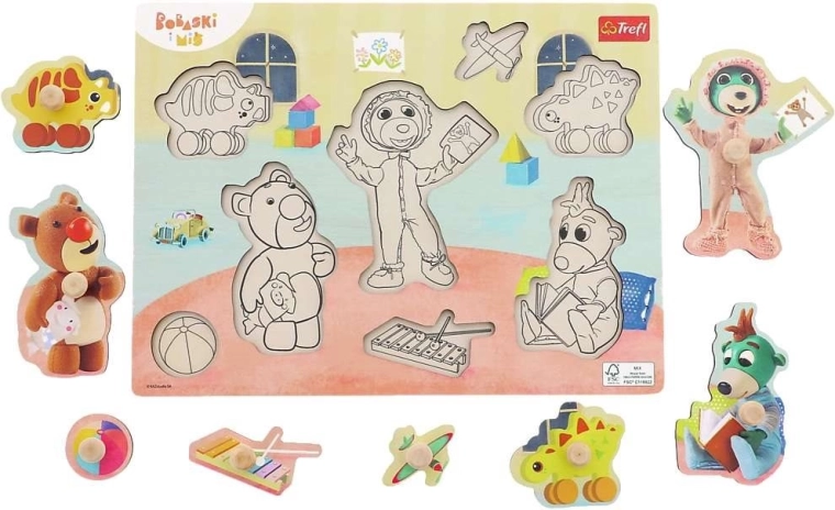 De houten puzzel met het thema BOBASKI I MIŚ is ontworpen voor de allerkleinsten. Stevige stukjes met grote houten knopjes liggen goed in kleine handjes. De basis met uitgefreesde vormen en overeenkomende zwart-witte grafiek onder de stukjes maakt het toewijzen van de juiste vormen eenvoudig en ondersteunt de zelfstandigheid tijdens het spelen.