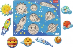 De houten inlegpuzzel met ruimtethema is een geweldige keuze voor de eerste logische spelletjes. Dankzij de houten knopjes zijn de stukjes ook voor kleine handjes goed vast te houden en trainen kinderen tijdens het spel hun precisie en geduld. De zwart-witte afbeeldingen in de uitsparingen weerspiegelen de illustraties op de stukjes en vergemakkelijken het correct plaatsen.
