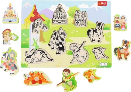 Deze middelgrote houten inlegpuzzel met een kasteelthema is een uitstekende keuze als eerste puzzel. De ondergrond heeft uitgefreesde vormen en zwart-witte voorbeelden die kinderen helpen om de stukjes correct toe te wijzen. Elk van de 8 stukjes is voorzien van een houten knop voor gemakkelijk vastpakken met kleine handjes.