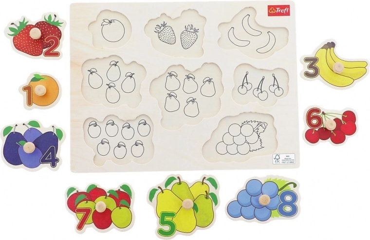 Ontdek kwalitatieve houten puzzels met een fruitmotief die de handvaardigheid en logica van kinderen ontwikkelen. Dankzij 8 uitneembare stukjes met houten knopjes zijn de puzzels gemakkelijk vast te pakken, ideaal voor kleine handjes en geschikt vanaf 18 maanden. De ondergrond met zwart-witillustraties helpt kinderen vormen correct te matchen en leert ze fruit op een speelse manier kennen.