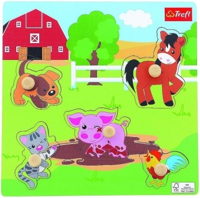 Ontdek een leuke en leerzame speelgoedklassieker voor de kleinsten: een houten puzzel met boerderijthema en vijf stukjes met knopjes. Duurzaam hout, makkelijk vast te pakken en heldere afbeeldingen ondersteunen de eerste vaardigheden van je kind en maken puzzelen extra leuk.