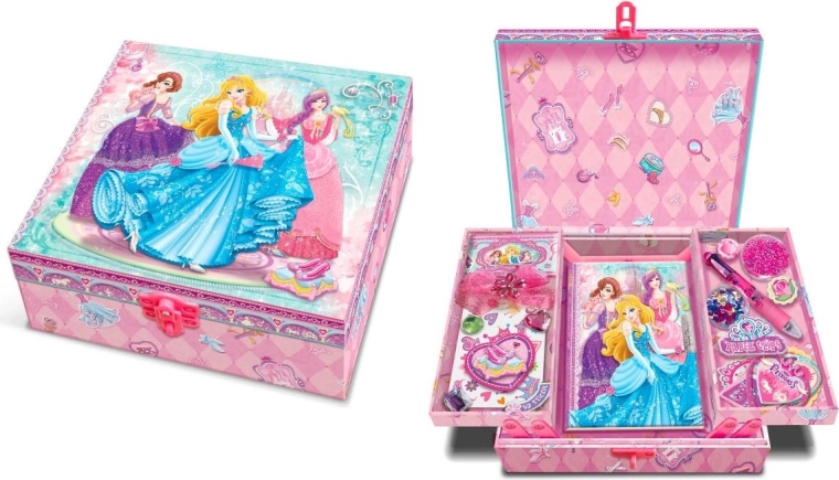Ontdek een betoverende cadeauset in een decoratieve doos met Princess-motief. Twee zijvakjes klappen eenvoudig open en daaronder zit een dagboekje voor geheime wensen en belevenissen. Perfect voor het opbergen van kleinigheden én voor dagelijks schrijven.